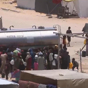 在加沙地带南部的汗尤尼斯,现在有数万人生活在临时搭建的简易帐篷里。在炎炎烈日的炙烤下,他们每天都要排队等送水车来取水。