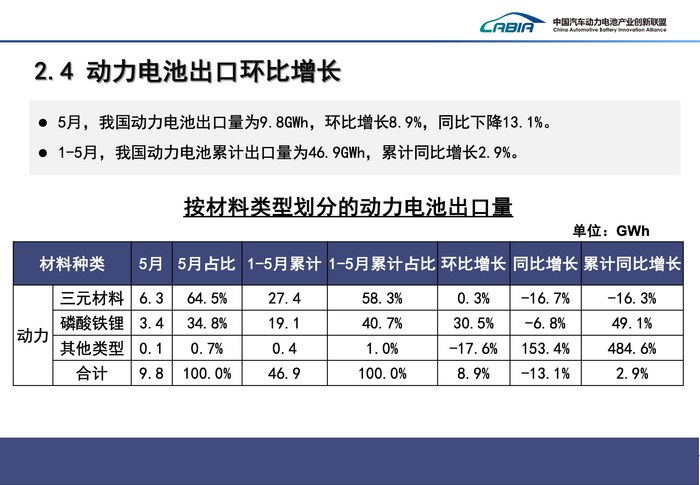 出口方面,今年1-5月,国内动力电池累计出口量达46.9 GWh,同比增长2.9%。其中,磷酸铁锂电池出口量为19.1 GWh,同比增长49.1%;三元电池出口量为27.4 GWh,累计同比下滑16.3%。海外市场对于磷酸铁锂电池的需求逐渐提升。