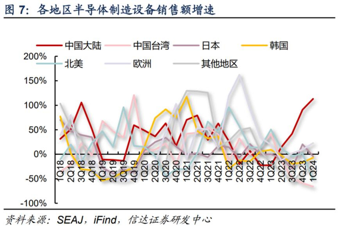 在国产化需求的支撑下,中国大陆也连续四个季度成为全球最大半导体设备市场。从销售额来看,据SEAJ统计,今年一季度全球半导体制造设备销售额264.2亿美元,同比下滑2%;中国大陆逆势大增,同期增幅达到113%。