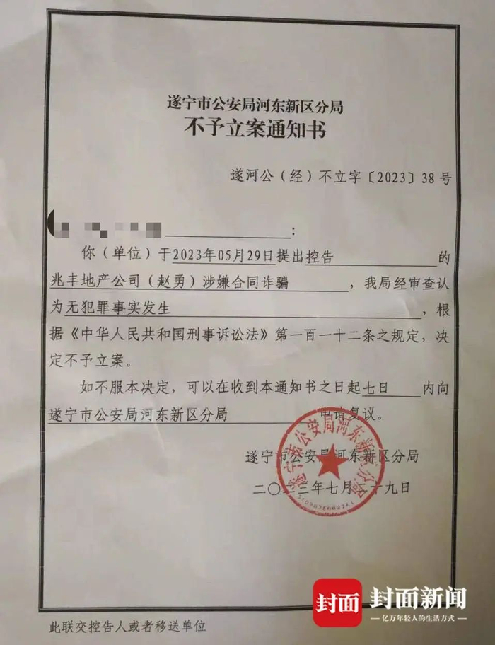 丁先生提供的遂宁河东警方《不予立案通知书》显示,关于他提出控告兆丰地产公司(赵勇)涉嫌合同诈骗,经审查认定后为“无犯罪事实发生”,决定不予立案。