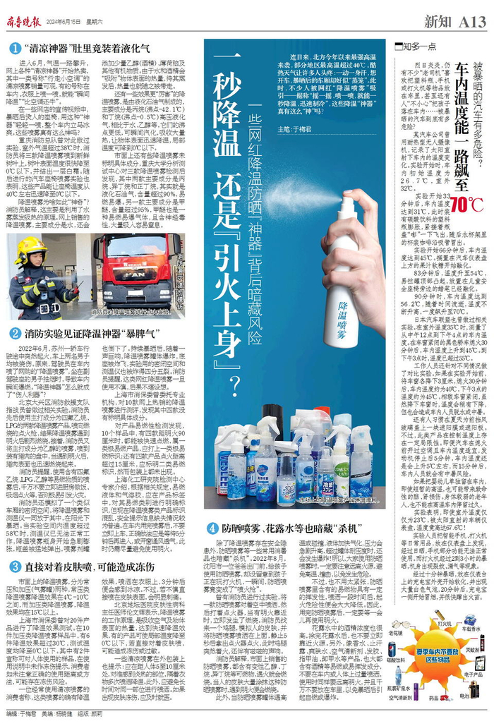 连日来,北方今年以来最强高温来袭,部分地区最高温超过40℃。酷热天气让许多人头疼:一动一身汗,想开车,暴晒后的车厢却好似“蒸笼”。此时,不少人被网红“降温喷雾”吸引——摇一摇、喷一喷,一秒降温、迅速制冷,这些降温“神器”真有这么“神”吗?