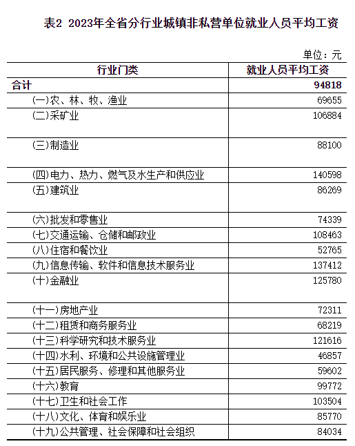 2023年,我省城镇非私营单位就业人员平均工资94818元,比上年增加4073元,增长4.5%。全省城镇私营单位就业人员平均工资51281元,比上年增加2787元,增长5.7%。