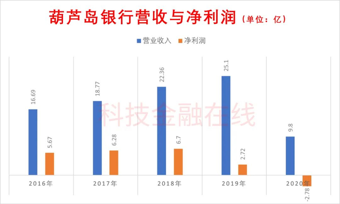2020年,葫芦岛银行营业收入9.8亿,同比下降了60.96%,亏损2.78亿。此前几年一直处于盈利状态。