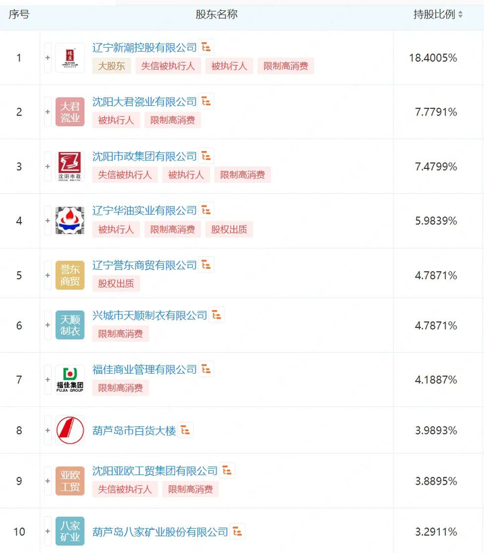 葫芦岛银行目前前十大股东中,竟然7个是失信被执行人,被限制高消费。真是一堆“难兄难弟”。
