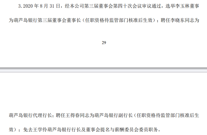 2020年8月,葫芦岛银行原行长王学伶因个人涉嫌严重违纪违法,接受审查调查。该行党委书记李玉林主持葫芦岛银行全面工作,并选举李玉林为葫芦岛银行新董事长。聘任李晓东为葫芦岛银行代理行长。