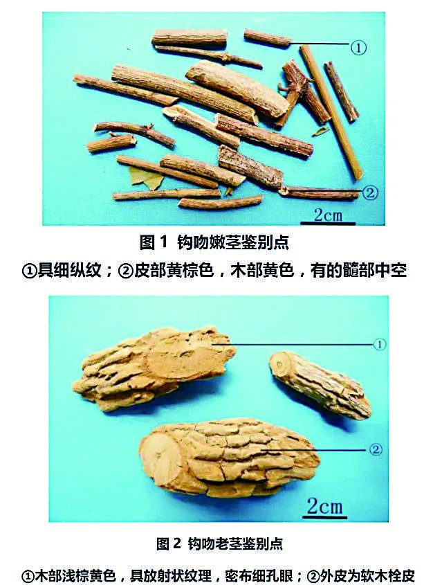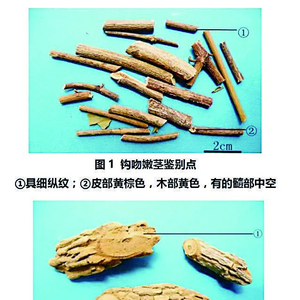 钩吻的根表面是棕黄色,有明显的纵纹,弯曲处会露出木心,并可块片状剥离;而五指毛桃的根表面一般是红棕色栓皮,纤维性强,能成片撕下。