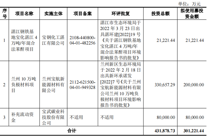 本次IPO,宝武碳业原计划拟募集资金30.12亿元,用于湛江钢铁基地宝化湛江4万吨/年混合法苯酐项目、兰州10万吨负极材料项目、补充流动资金。