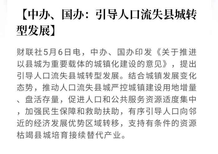 此前发布的《关于推进以县城为重要载体的城镇化建设的意见》,首次提出分类引导县城发展方向。