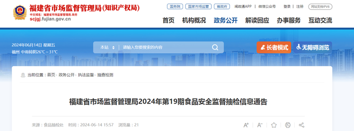 福建省市场监督管理局2024年第19期食品安全监督抽检信息通告