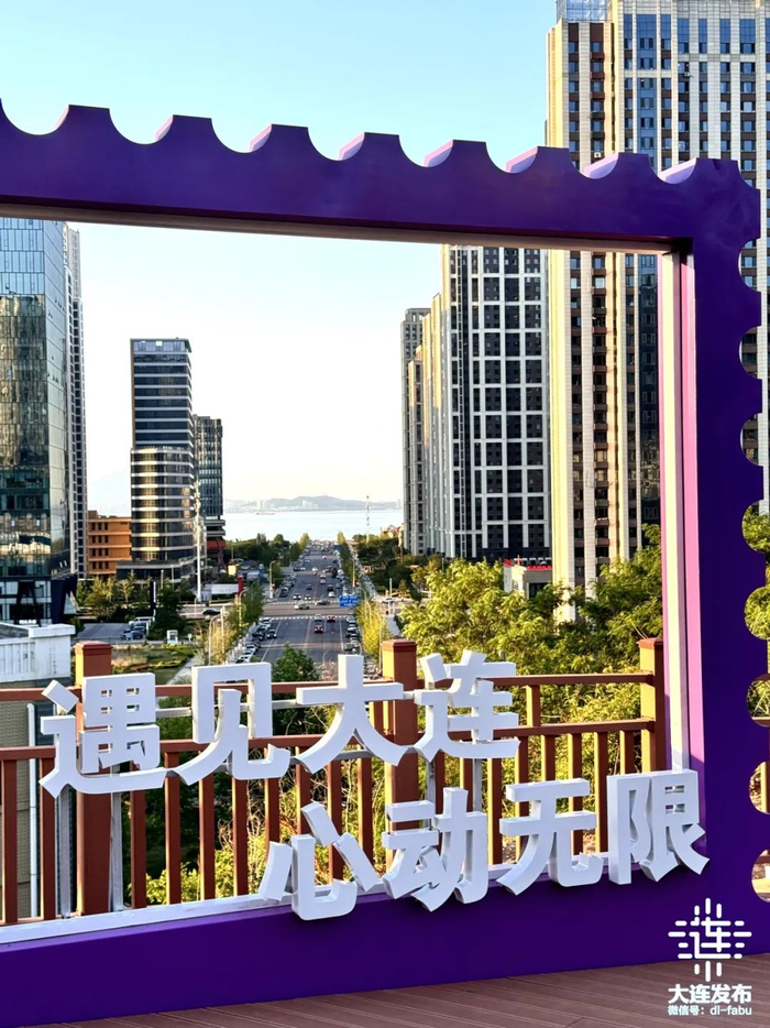漫步其间,远处大船汽笛长鸣,近处繁华与恬静相伴,不知不觉就走到了港东八街观景平台。在这里,市民游客可在邮票画框景观雕塑处打卡,从不同视野,再一次远眺“通海大街”“轮船穿楼”的景观。