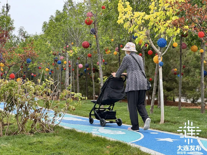 ● 长约1000米的林荫步道,连接港东五街至八街,采用彩色透水砼铺设,地面喷绘大船、海螺等代表大连特色的图案,步道两侧悬挂了近万个装饰彩球,为整个区域增添了更多的色彩和活力。