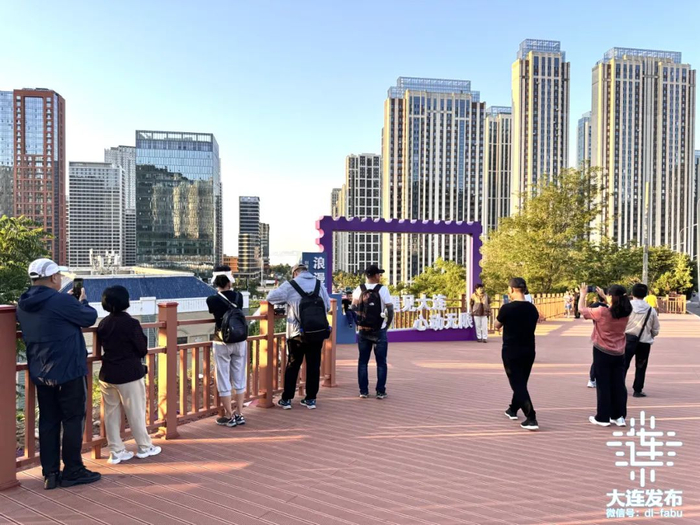 渴了,有免费饮用水服务站;人多,有交警疏导交通。想打卡集章?没问题!游客服务中心“小汽车”里,准备了201路百年有轨电车的明信片,还有大连全景、星海湾大桥和“滨海鹿”等印章,市民游客可以随意集章。