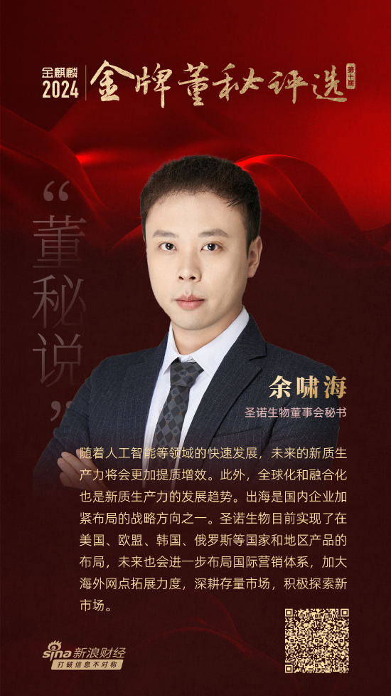 新浪财经主办的2024(第十届)金牌董秘评选重磅来袭!评选期间,新浪财经推出“董秘说”专访活动,聚焦新质生产力、ESG对企业发展的影响,探讨企业如何在实践中发展新质生产力以及在ESG的驱动下实现可持续发展,并通过董秘视角带领投资者深入了解公司情况。本期,董秘靳尚带你走进圣诺生物>>(给他投票)