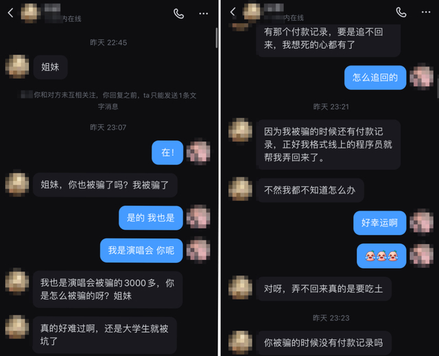 近日,杭州西湖区三墩某小区一名大学生莉莉(化名)通过微博找到一个代购演唱会门票的途径,莉莉支付给对方1699元门票,加500元代购费共计2199元。可想而知,莉莉既收不到门票也等不到退款,知道自己被骗后,莉莉一心想把被骗的钱追回来,于是她就在某APP平台上搜索买演唱会门票被骗的钱怎么要回来。没想到还真有人发帖讲述自己类似的经历,遇到了和自己有相同经历的网友,莉莉迫不及待地在帖子上留言并等待回复。