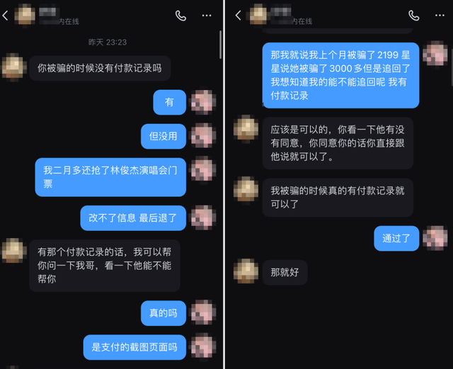 “姐妹,你也被骗了吗?我被骗了”不久后,“小红薯”主动联系了莉莉,他告诉莉莉自己是在广东某大学的学生李星星,前期在网上买林俊杰的演唱会门票被骗了3000元,幸好有付款记录,昨天顺利把钱追回来了。在莉莉追问下,“李星星”透露了自己有个当程序员的哥哥,是哥哥通过付款记录,黑了骗子的微信号把钱拿回来了。莉莉眼前突然看到了希望,“李星星”也鼓励莉莉,只要有付款记录,请哥哥这个技术绝顶的“黑客”帮忙,肯定可以把钱拿回来!