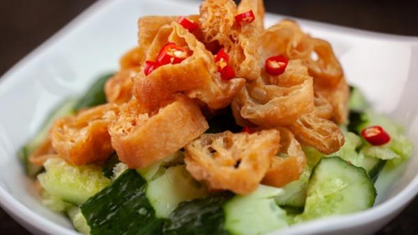 菏泽面泡是一种油炸面食。刚出锅的面泡底部酥脆,上部蓬松,里面形似蜂窝、孔孔相连。无论是配豆浆还是凉拌,都相当美味。面泡拌黄瓜是专属于菏泽的一道夏日美食。将面泡炸好切碎,把黄瓜洗净拍碎,大蒜加盐捣成蒜泥,放醋、香油、麻汁,再放少许白糖,搅拌均匀即可,制作简单,美味无比。