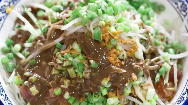 在博山,吃凉面是非常讲究的。非挂面不筋爽,离麻汁不香,缺椿芽咸菜无味,少红萝卜咸菜暗淡,无黄瓜丝则不俏,随蒜泥、香醋才真正算得上是美味齐全,纯正地道。