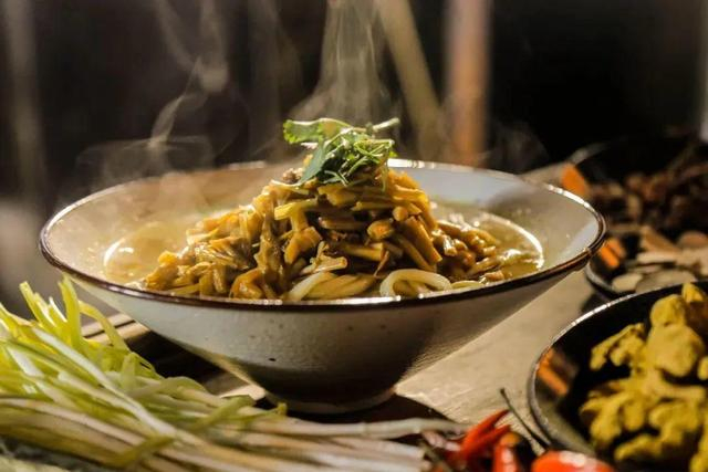 黄花牛肉面,精选上等焙干黄花菜、本地成年黄牛精肉和具有温补、散寒、理气作用的30多种天然植物的根、茎、叶、果,加之多种调味佐料一同汇入牛骨头高汤,炖煮出芬芳扑鼻的黄花牛肉汤。喷香的黄花牛肉汤,浇在手工擀制的面条上,加入香菜、辣椒、香油等佐料,一碗赏心悦目的“黄花牛肉面”就诞生了。不仅风味独特,口感纯正清爽,味感厚重饱满,餐后更是余香绵长。