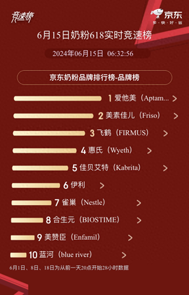 在京东超市618奶粉品牌竞速榜上,爱他美、美素佳儿、飞鹤、惠氏、佳贝艾特等知名品牌奶粉排名前列,含有DHA、乳铁蛋白、益生菌等成分的配方奶粉,满足婴幼儿个性化营养需求。