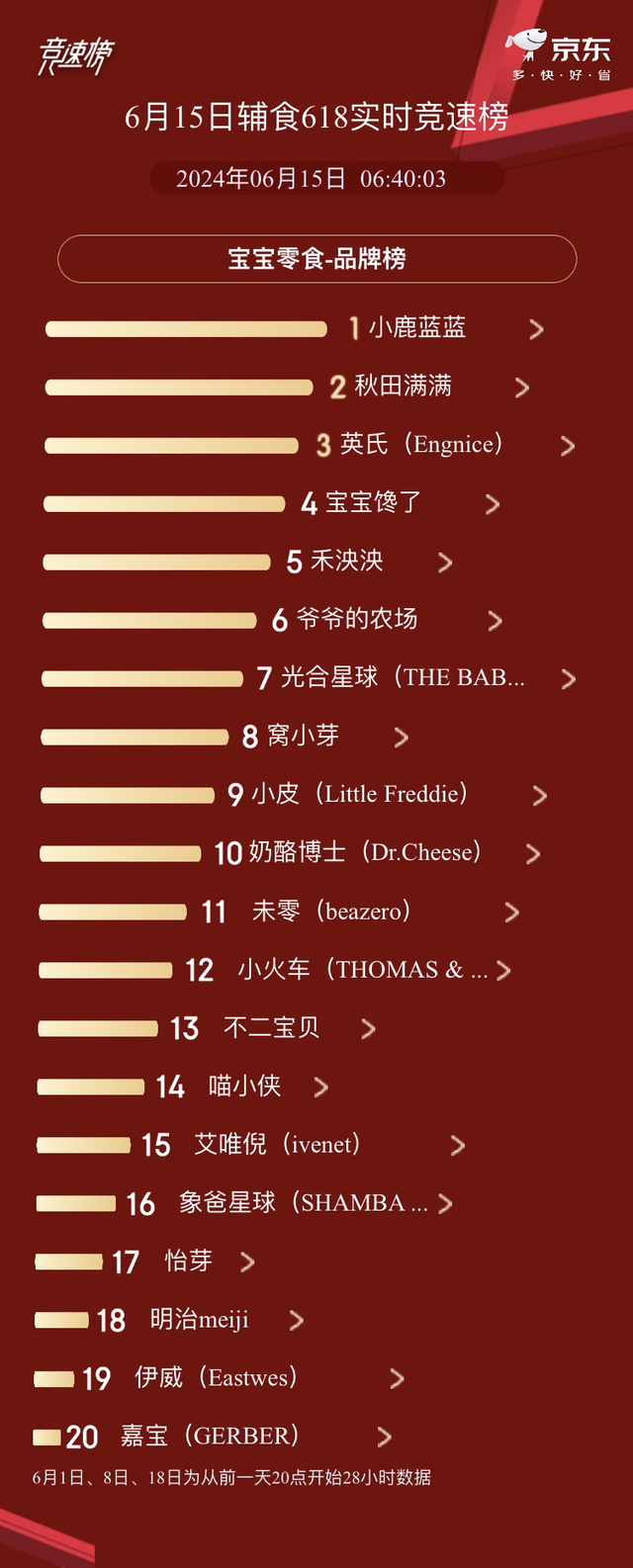新生儿从6个月起可以添加辅食,宝宝零食也能够为宝宝提供更丰富的口感和乐趣,京东超市618宝宝零食品牌竞速榜提供丰富的参考。小鹿蓝蓝、秋田满满、英氏、宝宝馋了、禾泱泱等品牌上榜,以果泥、粥、米粉等品类应有尽有,为宝宝带来营养均衡的食物,让孩子们喜欢吃饭。