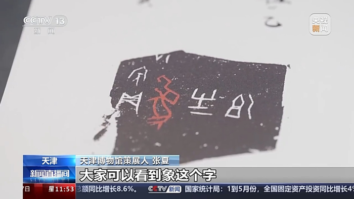 天津博物馆策展人 张夏:其实在考古发掘中也发掘出来大量的大象的骨头,包括象牙制品什么的,这也说明当时殷墟是有大象的。大家可以看到大象这个字是非常象形的,长鼻子的感觉,很像一幅孩童画的画,也体现了我们汉字源头那种可爱、童真、朴拙之处。