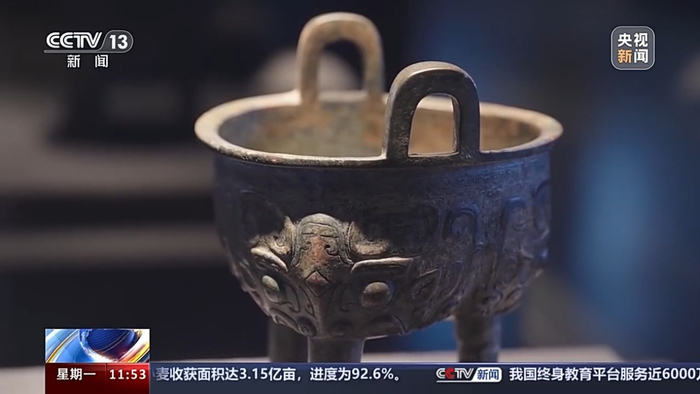 天津博物馆策展人 张夏:我们有一件蝉纹鼎,大家可以看上边蝉纹非常的生动形象,就好像是一只知了伏在树上一样,然后它还是个连环的纹饰。细看起来它线条是非常精细,非常考究的,也是当时人审美的一种表现。
