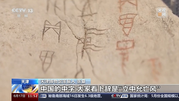 天津博物馆策展人 张夏:中国的“中”字,大家看卜辞是“立中允亡风”,大概就是在场地的中间立一根旗杆,然后根据上面飘带的方向来判断风速和风向,慢慢就引申出了中间、中央的意思。后来也变成了我们中国的“中”字。然后“国”字它的形象像一个拿着武器去守卫的感觉,然后慢慢就引申为国家的意思。