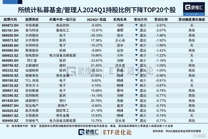 纳入统计的百亿私募管理人,一季度持股比例降低最多的20只股票包括中炬高新、皇马科技、方邦股份、兴齐眼药、长阳科技等。