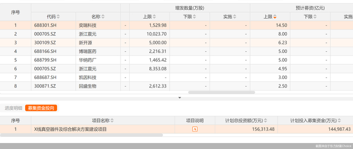 从定增募资金额来看,奕瑞科技拟募金额最高,为不超14.5亿元,也是今年以来唯一一股拟募资额在10亿元以上的医药股。
