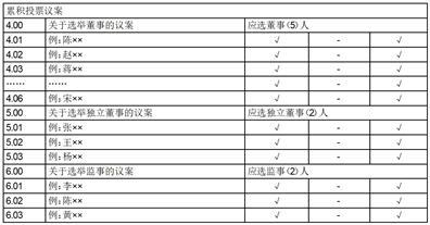 某投资者在股权登记日收盘时持有该公司100股股票,采用累积投票制,他(她)在议案4.00“关于选举董事的议案”就有500票的表决权,在议案5.00“关于选举独立董事的议案”有200票的表决权,在议案6.00“关于选举监事的议案”有200票的表决权。