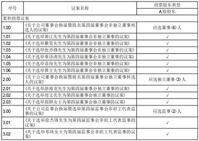 一、股东大会董事候选人选举、独立董事候选人选举、监事会候选人选举作为议案组分别进行编号。投资者应针对各议案组下每位候选人进行投票。