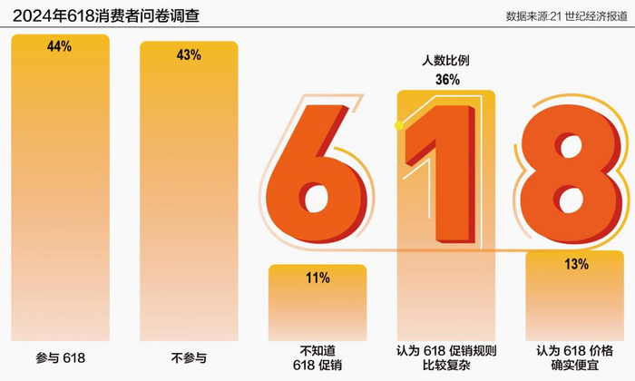 在消费者端,感知却不尽相同。为了深度了解消费者的购物行为和趋势,21世纪经济报道发起《2024年618消费者问卷调查》,该问卷对百位来自不同城市、不同职业、不同年龄段的消费者发起调查,并进行了一对一进行访谈,了解其在今年618的购物体验与感受。