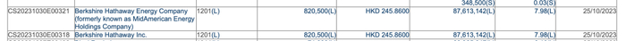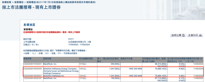 据港交所披露的文件显示,巴菲特掌舵的伯克希尔哈撒韦公司在今年6月11日减持了134.75万股比亚迪H股,减持的每股平均价格为230.46港元,据此计算,合计交易金额约3.11亿港元。