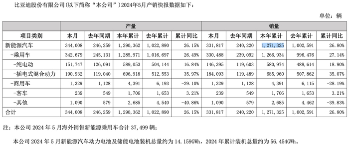 根据比亚迪在今年6月初发布的最新产销快报,5月比亚迪新能源汽车销量达到33.18万辆,同比增长了近四成,已经逼近去年12月的历史最高销量34.1万辆。截至5月底,比亚迪今年累计销量突破百万辆,达到127.13万辆,同比增长26.80%。