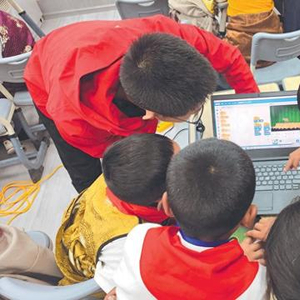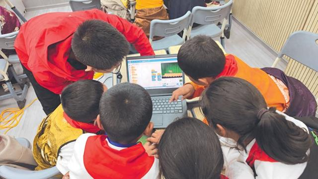 ①中国联通志愿者在革吉县盐湖乡小学进行趣味编程授课。