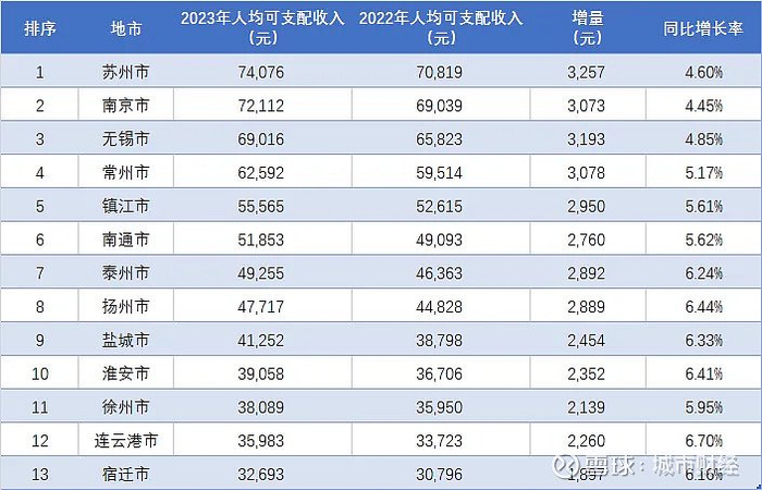 收入方面,2023年江苏13个城市,有9个超过全国39218元平均值,其中苏州、南京最高,都在7万以上。无锡第三,常州第四,都在6万以上。