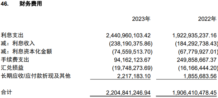 高额的财务费用侵蚀着中建七局的利润。2023年,中建七局的财务费用高达22.05亿元,相比于2022年的19.06亿元增加了近3亿元。其中,2023年利息支出为24.41亿元,相比于2022年的19.23亿元增加约5亿元。