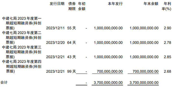 另外,在去年12月,中建七局在10天时间内连续发行了四笔超短期融资券以补充流动资金,共计37亿元,利率介于2.68%-2.9%之间。