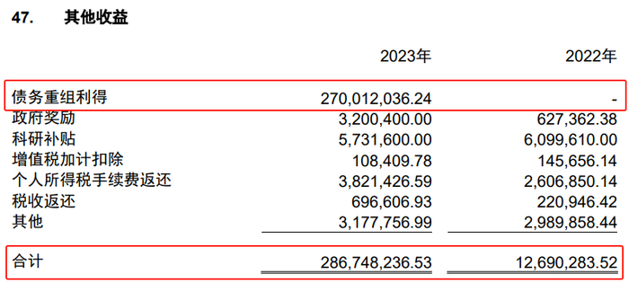另一方面,中建七局在2023年猛增的“其他收益”为最后的利润扳回一局。期内,其他收益为2.87亿元,占净利润的比重近50%。而其他收益的主要来源是“债务重组利得”,2023年该项的发生额为2.7亿元。债务重组利得是指企业进行债务重组过程中得到的优惠。