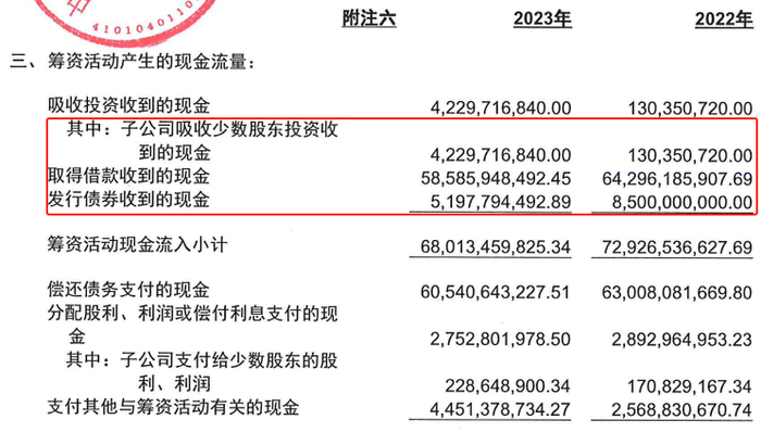 2023年,中建七局子公司吸收少数股东投资收到的现金为42.3亿元,2022年为1.3亿元,前者是后者的32倍还多。