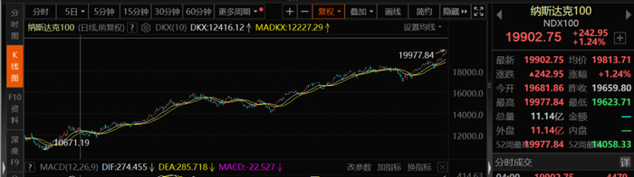 同期,纳指从2023年1月开始,一路上扬。截至目前,指数已经接近翻倍。
