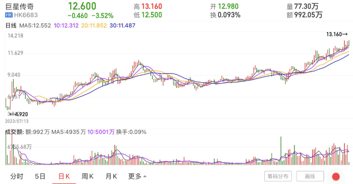 二级市场方面,巨星传奇发行价每股4.25港元,其上市后股价震荡走高。当前该公司股价在12港元左右徘徊,已较发行价涨超180%。若以今年来看,该公司股价累计涨幅接近60%。