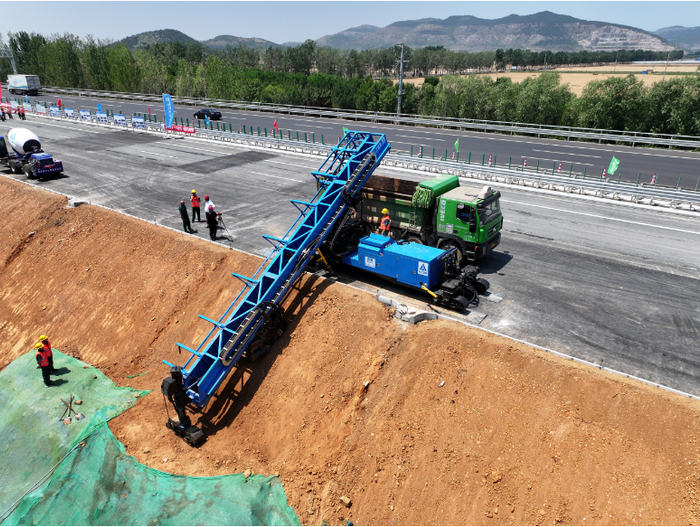 此外,在高速公路边坡底部,道路边沟智能建造装备正在进行边沟开槽、滑模一体化作业,修建排水边沟。这台装备类似躺倒的搅拌机,还长出了锯齿,在平地上一口一口向前“啃”出了凹槽,“啃”出的土由传送带抛到侧面的小型渣土车上。后面紧跟着能一次性清底和浇筑混凝土的模具,这套装备把开槽-清底-混凝土浇筑三道工序合而为一。