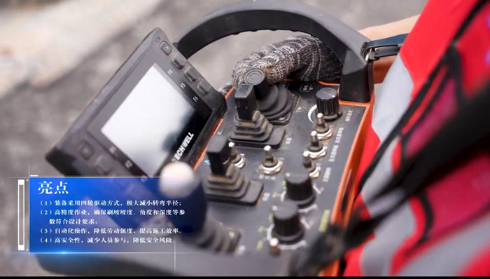 看似简单的边沟施工背后,同样有高科技加持。技术人员介绍,该套装备搭载了北斗导航、激光找平和无人驾驶系统,可根据边沟断面形式快速更换功能模块,一体化作业高程误差控制在5毫米以内,每日可完成240米边沟建造,施工质量和效率较传统人工作业显著提高。