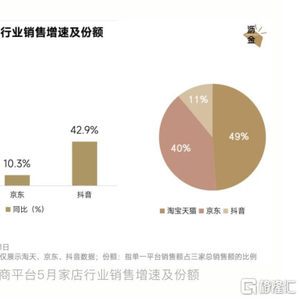 6月17日,消费研究机构沥金发布《618消费电子行业观察》,来自数据机构魔镜洞察显示:淘宝天猫平台5月家电行业销售额增速达74.2%,市场份额49%,均名列全网第一,显著领先其他平台。