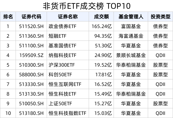 截至今日收盘,政金债券ETF、短融ETF、基准国债ETF成交额居市场前列,分别达165.24亿、94.35亿、51.30亿。宽基类ETF共计3只,分别是沪深300ETF、科创50ETF、上证50ETF。行业主题类ETF共计4只,分别是纳指科技ETF、恒生互联网ETF、恒生科技ETF、恒生科技指数ETF。