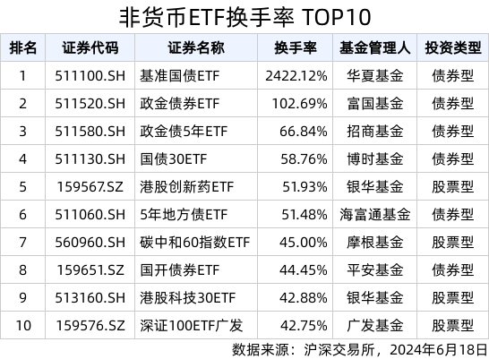 2024年6月18日,非货币类ETF合计成交951.20亿元,其中有16只ETF成交额破10亿元。