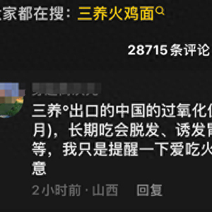 起因是某社交平台的一个网友称大家爱吃的三养火鸡面出口中国的过氧化值超标,长期吃会脱发、诱发胃癌等。