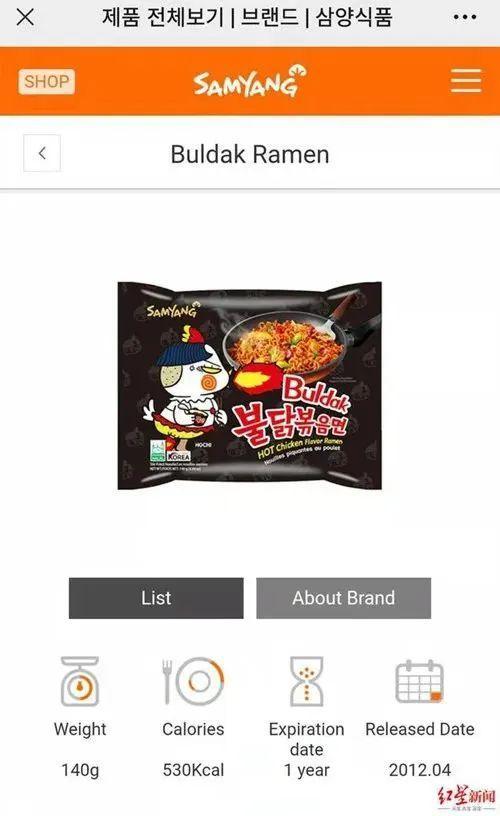 此外,国内某网购平台的三养食品旗舰店主页显示,“超辣鸡肉味拌面”(即“火鸡面”)产地为韩国,保质期为12个月。