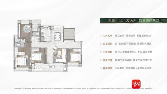 第一,127做4房,目前市场极少有开发商在130平米以内来做四房产品,所以源上九里四房的总价低,性价比非常高;第二,南北通透,两梯两户无连廊,四开间朝南、独立餐厅,通风采光都特别好。第三,LDKB客厅、餐厅、厨房、阳台一体化的设计;第四,豪宅尺度的超长贯通式阳台,舒适度拉满,不论是家常晾晒、还是躺椅享受阳光,都非常合适。